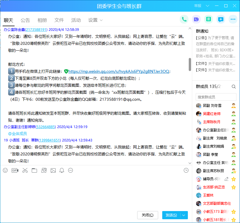 4月4日举行全国哀悼日,恰逢也是清明节,是个深切哀悼逝世亲人、缅怀先烈的日子。4月4日10点起全国人民共同哀悼3分钟,禁止鸣笛防空警报长鸣。在校教师及未返校师生响应国务院号召,积极参与本次哀悼活动,以此表达对全国各族同胞在抗击新冠肺炎斗争中的无私奉献和对逝去的同胞深深的哀悼之情。此外,同学们还响应学校团委号召,登录“致敬·2020清明祭英烈”云祭祀互动平台,为先烈们线上献花。同时,为了引导同学们在清明期间继续做好疫情防控工作,各班班主任还在班群里提醒同学们注意外出祭祀需要牢记的六大建议,包括出门务必戴好口罩,不扎堆,不聚集等内容。