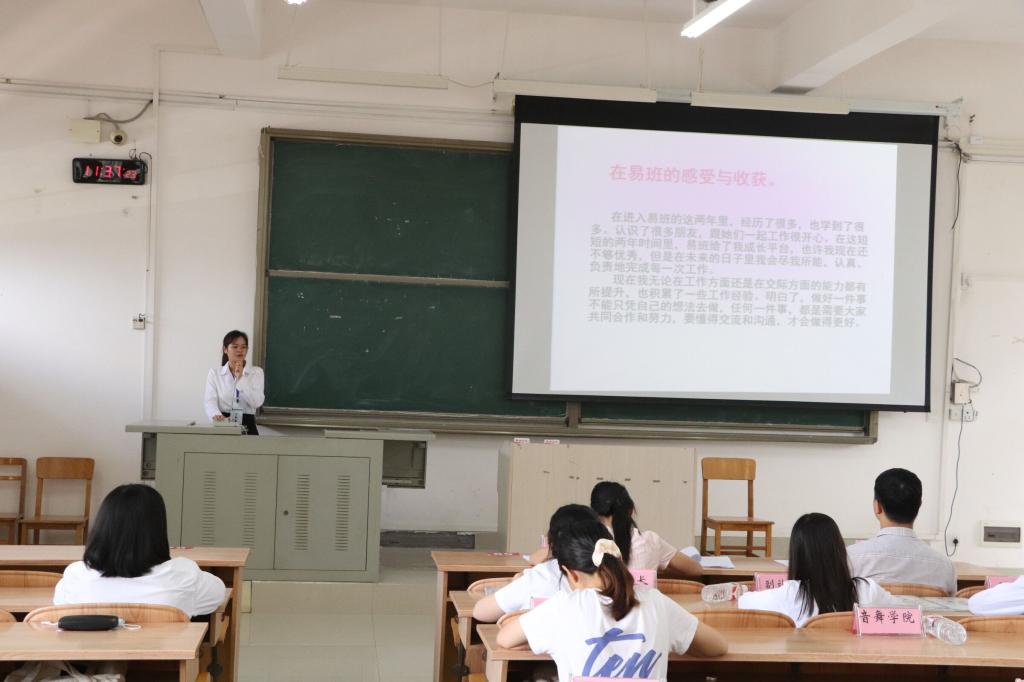 本次换届大会主要有八个流程,即部长竞选人上台演讲、对部长候选人进行投票、站长团竞选人上台演讲、对站长团候选人进行投票、蒋菊玲站长总结发言、覃良慧老师上台致词、评为老师为站长团和部长成员颁发聘书、宣布竞选结果并合影留念。站长蒋菊玲在发言中回顾了这两年在易班的工作经历,并对过去一年来易班的工作进行总结,她希望同学们能够继续保持热情,充分利用易班平台,提高自己各方面的能力。覃良慧老师在致词中对易班各成员的努力、用心以及工作成果给予了充分的肯定,对同学们的积极竞选表示赞扬和感谢,她希望新一届干部能够明确职责和使命,勇挑重担,以上率下,团结互助,同时谦虚向学姐学长们请教,努力提高自己各方面的技能和水平。