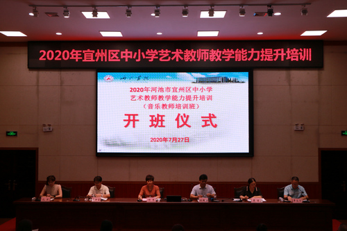 7月27日上午8:00,宜州区2020年中小学艺术教师教学能力提升培训班(音乐班)开班仪式在我校弘毅楼1区205报告厅举行。万象城awc官网登录入口万象城awc官网登录入口院长邓琴、党委书记李新富,宜州区教育局副局长兰国伟、德育与师范股股长黄佳、宜州区教育局德育与师范股副股长、艺术学科教研员沈迪等领导出席开班仪式。开班仪式由万象城awc官网登录入口覃永宁老师主持。