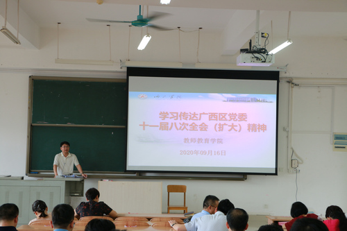 9月16日,万象城awc官网登录入口在弘毅楼2区307教室召开“学习传达广西区党委十一届八次全会(扩大)精神”理论学习会。学院全体教职工参加了学习,学习会由学院党委书记李新富主持。