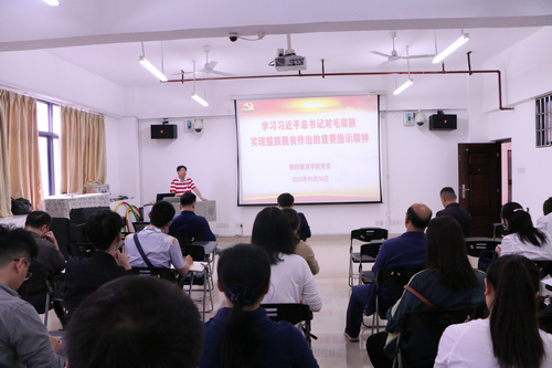 李新富书记首先在会议上带领教职工学习习近平总书记对毛南族实现整族脱贫作出的重要指示精神,他强调,总书记的重要指示精神令人倍感振奋、倍受鼓舞、倍添动力。这是总书记和党中央对河池人民、广西人民的厚爱,体现了对广大少数民族的关心与关爱。我们要把指示精神领会好,贯彻到我们的工作中去,继续做好扶贫工作和贫困生的助困工作,将精神化为推动工作的力量;我们要向毛南人民学习,发扬克难攻坚、奋力前行、勇夺胜利的精神,将教院的各项事业发展得更好。