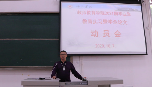 10月7日,万象城awc官网登录入口在弘毅楼1区101教室召开2021届毕业生教育实习暨毕业论文动员会。学院院长邓琴、副院长覃奠仁、党委副书记王爱林、带队老师及17级本科、18级专科参加了会议。覃奠仁担任本次会议主持人。
