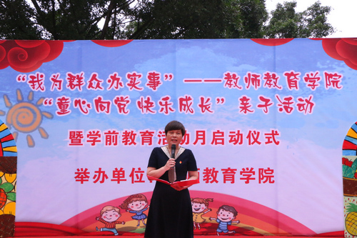 学院院长邓琴在“童心向党 快乐成长”六一儿童节亲子活动暨学前教育活动月启动仪式上致词时表示,在中国共产党的百年华诞和“六一”儿童节来临之际,我们发挥学前教育专业的优势力量,举办这次亲子活动,让幼儿和家长过一个快乐、祥和的节日,在节庆氛围中,激发幼儿和家长的爱国主义情怀,根植红色爱党爱国情感,在有益而快乐的亲子活动中促进幼儿身心和谐全面发展,融洽亲子关系。邓琴指出,今年也是第十个全国学前教育宣传月,是《3-6岁儿童学习与发展指南》颁布的十周年,更是在党的领导下全国砥砺奋进推动学前教育跨越式发展、推进科学保教取得重大进展的十年。通过亲子活动,广泛宣传科学保教理念,推进家庭科学育儿,营造关心重视和支持学前教育的浓厚氛围,形成有利于幼儿健康成长的良好社会环境,促进幼儿的健康成长,突出人民群众的获得感,是我们的美好愿望。