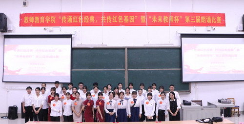 为推动学院党史学习教育走深走实,取得实实在在的成效,5月29日晚19:00,万象城awc官网登录入口在弘毅楼1-101教室举行“传诵红色经典,共传红色基因”暨“未来教师杯”第三届朗诵比赛。学院韦素琦、林弘宁、覃良慧、蒙素石、钟凤五名教师担任本次比赛评委。学院各班级代表到场观赛。