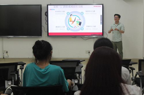 活动伊始,孟亚运结合自身的人生经历,就“什么是压力”、“压力的来源”、“大学生如何应对压力”等问题与在场的同学进行交流探讨。活动中,孟亚运指出了生活中压力的来源、形式及对同学的负面影响,对其作了详细的分析,并告诉同学正确的处理方式。