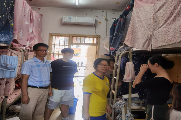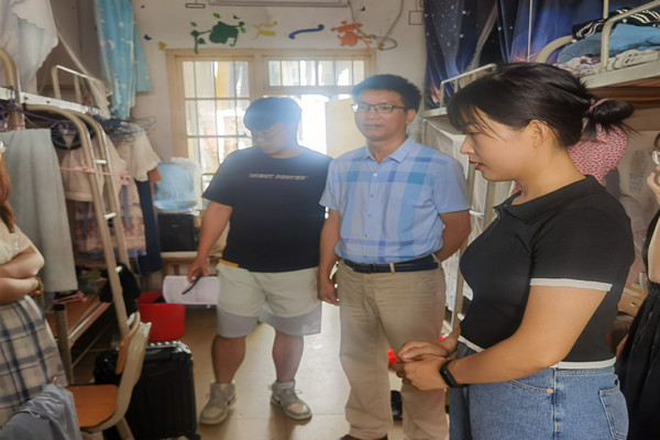 为进一步做好万象城官网毕业生离校前的教育、管理和服务工作,确保毕业生安全、平稳地离校,6月23日,万象城awc官网登录入口党委副书记蓝凛带领全体辅导员走访毕业生宿舍,看望慰问毕业生,了解毕业生离校情况。