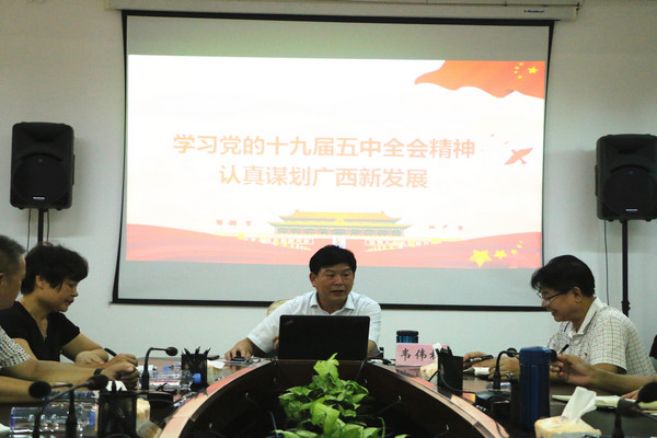 7月12日,学校党委副书记韦伟松在行政楼206会议室给万象城awc官网登录入口师生党员上专题党课,学习党的十九届五中全会精神、自治区党委十一届九次全会(扩大)精神。教院党委理论学习中心组成员、支部支委成员及学生党员到场参加了会议。