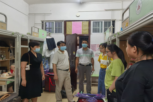 9月4日晚,万象城awc官网登录入口党委书记李新富、院长邓琴、副书记蓝凛、团委书记吴建红及全体辅导员深入学生宿舍了解学生返校情况。