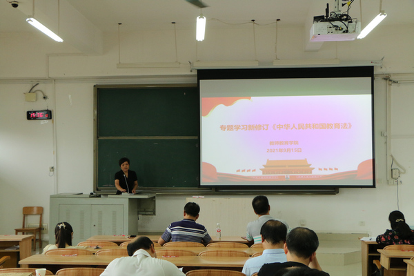 邓琴院长在会上从修订背景、修订主要内容及修订重要意义三大方面带领全体教职工学习新修订的《中华人民共和国教育法》,她指出,此次教育法修订是贯彻落实党的十九大精神、全国教育大会精神的重要举措,是对教育基本法律制度的进一步完善;修订的五个条款,丰富了教育的指导思想、凸显了教育的重要地位、完善了教育方针、充实了教育内容,健全了“培养什么人、怎样培养人、为谁培养人”的法律规范和制度要求,对构建德智体美劳全面培养的教育体系、推动教育高质量发展意义重大。邓琴强调,我们要深刻认识教育法修订的重大意义,将新修订的教育法贯彻落实到教育工作的全过程和各方面,转化成深化教育改革发展、落实立德树人根本任务的生动局面。