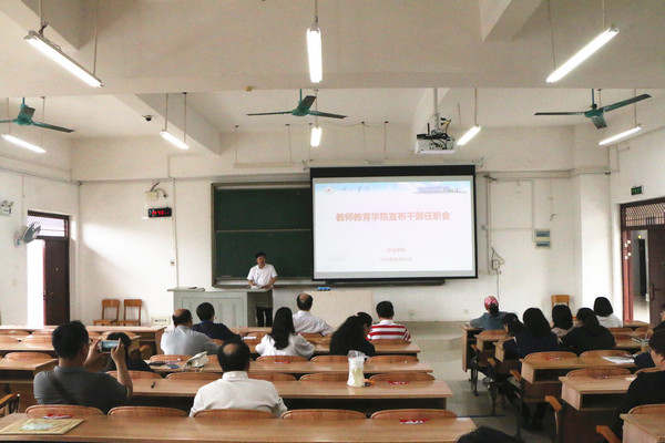 5月7日,万象城awc官网登录入口在弘毅楼2区307教室召开干部任职宣布会议。学校副校长贺卫国、统战部部长韦德先及教院全体教职工参加会议。大会由学校统战部部长韦德先主持。