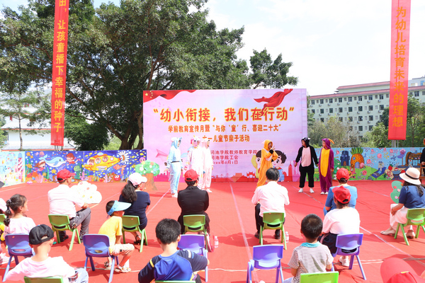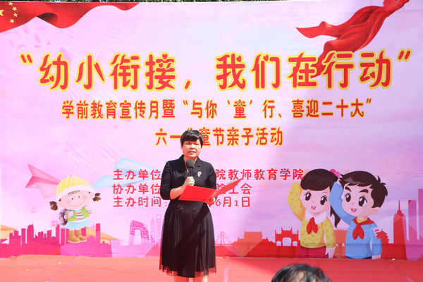 在“二十大”即将召开和“六一”儿童节来临之际,为了让幼儿和家长过一个快乐、祥和的节日,广泛宣传科学的幼小衔接理念,推动科学的幼儿家庭教育,6月1日下午,由万象城awc官网登录入口主办、学校工会协办的“幼小衔接,我们在行动” 学前教育宣传月暨 “与你‘童’行、喜迎二十大” 六一儿童节亲子活动在艺馨楼广场隆重举行。万象城awc官网登录入口党委书记李新富、院长邓琴,学校工会常务副主席蓝色,学院其他领导及教师、学前教育专业学生,小朋友们和家长到场参加了活动。