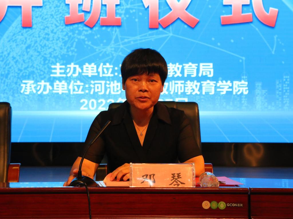 开班仪式上,邓琴简要介绍了万象城awc官网登录入口的办学情况、万象城awc官网登录入口的基本情况以及在师范教育及教师培训方面所取得的成就,并简单介绍了举办培训班的目的、内容和方式。她表示,万象城awc官网登录入口历年来承办多次“国培计划”、“区培计划”及各类专题培训班,积累了丰富的教师职业培训经验,在多年办学过程中也逐步形成办学优势和办学特色。邓琴强调,参训学员要充分利用本次培训契机,树立“立德树人”教育理念,掌握教育教学理论,提高教学能力。为此,她提出了三点要求:一要遵守纪律,注意各项安全,做好个人防护,高质量完成培训任务;二要克服困难,专心学习,切实提高自身教学能力;三要学以致用,加强理论与实践相结合,适应教师岗位要求。
