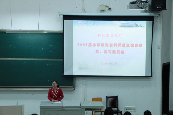 为增强学生从事教育工作的光荣感和责任感,提高学生从事小学教育教学的独立工作能力,3月26日,万象城awc官网登录入口在弘毅楼1-101教室召开2023届小教全科教育见习、实习动员会。学院副院长樊仲光、党委副书记郭英莉、初等教育系主任莫燚、实习指导老师及2023届小教全科专业全体学生参加本次实习动员会。动员会由韦雅文老师主持。