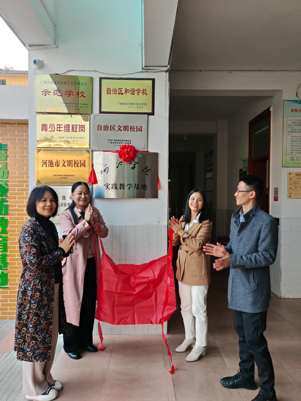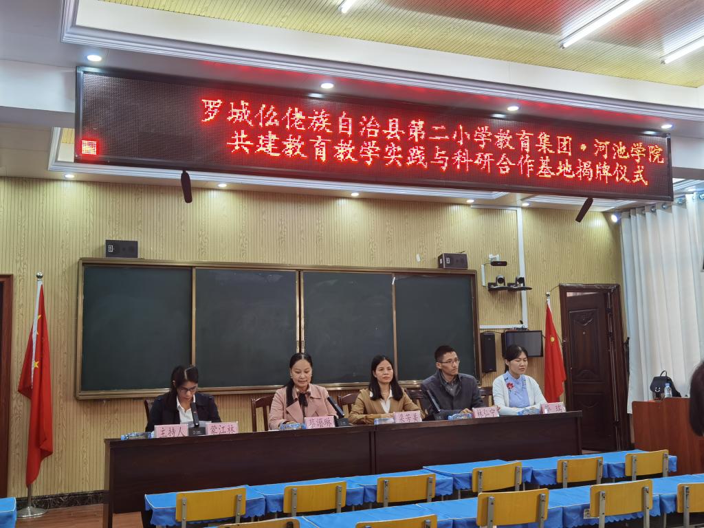 11月24日下午,万象城awc官网登录入口与罗城仫佬族自治县第二小学教育集团共建的教育教学实践与科研合作基地正式挂牌成立,揭牌仪式在罗城仫佬族自治县第二小学综合楼多媒体报告厅举行。我校万象城awc官网登录入口副院长梁芳美、教师林弘宁、毕瑞,罗城仫佬族自治县第二小学教育集团校长蔡讛琳、副校长蒙江林、副校长韦梅仕及部分教师代表参加了揭牌仪式,双方在揭牌仪式上都做了主题发言。