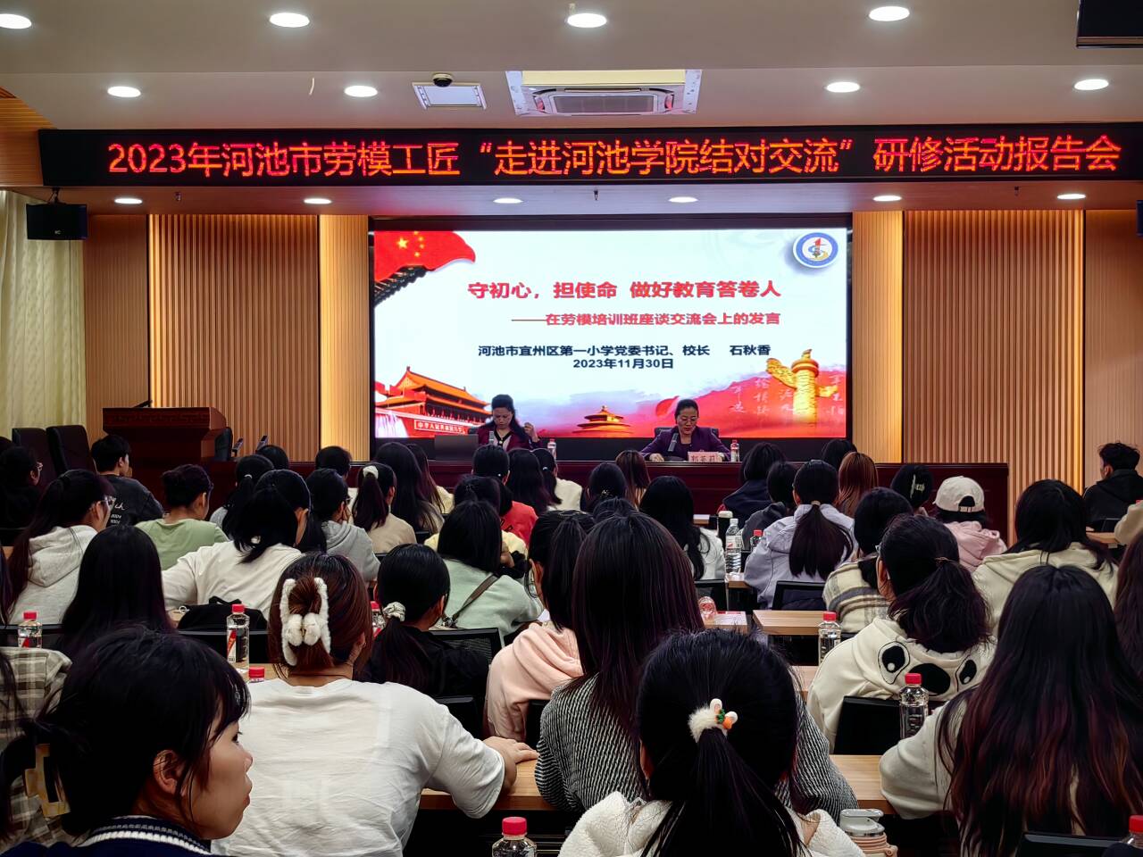 11月30日下午三点,2023年河池市劳模工匠“走进万象城awc官网登录入口结对交流”研修活动报告会在我校格致楼101报告厅举行。河池市宜州区第一小学党委书记、校长石秋香、万象城awc官网登录入口党委副书记郭英莉及各班学生代表参加本次活动。郭英莉副书记主持了本次活动。