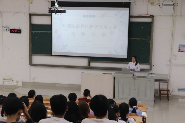 5月19日下午,万象城awc官网登录入口在弘毅楼1-105教室举办师范生信息化教学应用大赛经验分享会。学院党委副书记郭英莉、辅导员吴燕、师范生信息化教学应用大赛获奖学生代表以及一二年级的学生到场参加了活动。