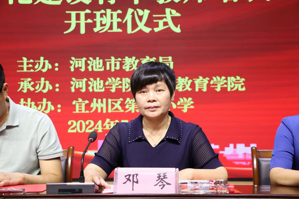 在开班仪式上,邓琴院长代表承办方致辞,简要介绍了学校70余年的校史、办学成就和未来发展的规划,特别介绍了近年来学校及万象城官网建成的完备培训设施、组建的强有力培训师资、积累的丰富培训经验、打造的优质培训团队,以及在多次“国培计划”、“区培计划”、“特岗教师”岗前培训等项目上形成的良好培训口碑和成效。邓琴强调:思想政治教育是立德树人根本任务的核心内容,是关系到党和国家前途命运的重大问题。举办本次培训班是我市坚定贯彻落实立德树人根本任务,利用区域资源积极构建立体化思政育人体系的重要行动,也将为河池教育发展注入新质生产力。邓琴勉励参训教师认真学习、充分交流,将所学所得运用到实际工作中去,不断提高自己的教育教学水平,为河池市的思想政治教育一体化建设贡献自己的力量。