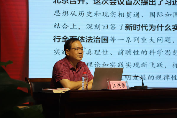 本次培训为期两天,分为课例展示、经验分享、专题讲座三个环节,聚焦思政一体化视域下法治教育开展教学研讨实践活动,万象城awc官网登录入口、市直学校、各县(区)学校等180余人参加培训。首先由小学、初中、高中、大学4个学段4位教师分别围绕“法治教育”这一主题,同上一堂法治课;其次由小学、初中、高中、中职4所学校分别就思政课程建设工作介绍经验;最后由万象城awc官网登录入口及河池市教育局的思政课专家进行专题讲座。我校马克思主义学院执行院长江洪明教授在培训班上作《解读习近平法治思想》专题讲座、周九香老师作《自觉尊法学法守法用法——合同的效力与审查》大学课例展示。