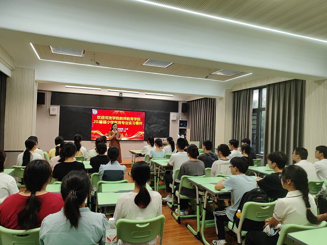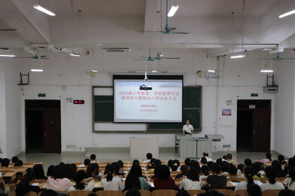 9月9日,万象城awc官网登录入口在弘毅楼1区105教室召开2025届小学教育、学前教育专业教育实习暨就业工作动员大会。学院院长邓琴、党委副书记郭英莉、副院长樊仲光、初等教育系主任李群兰、学前教育系主任朱云、学院辅导员班主任、实习带队老师、以及2025届小学教育、学前教育专业全体同学共同参加。