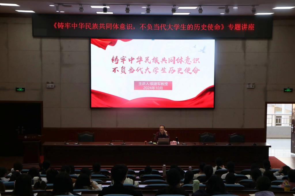 讲座中,银教授深入浅出地阐述了中华民族共同体意识的深刻内涵和重大意义,强调当代大学生作为新时代的主力军,肩负着重要的历史使命。他鼓励同学们要树立正确的国家观、民族观、历史观、文化观,增强对中华民族的认同感和自豪感;要积极参与民族团结进步创建活动,促进各民族之间的交流与合作;要努力学习科学文化知识,提高自身素质,为国家的发展和民族的繁荣贡献智慧和力量。在讲座过程中,同学们全神贯注,记录下重要的观点和感悟。互动环节中,同学们积极提问,与银教授进行了深入的交流和探讨。