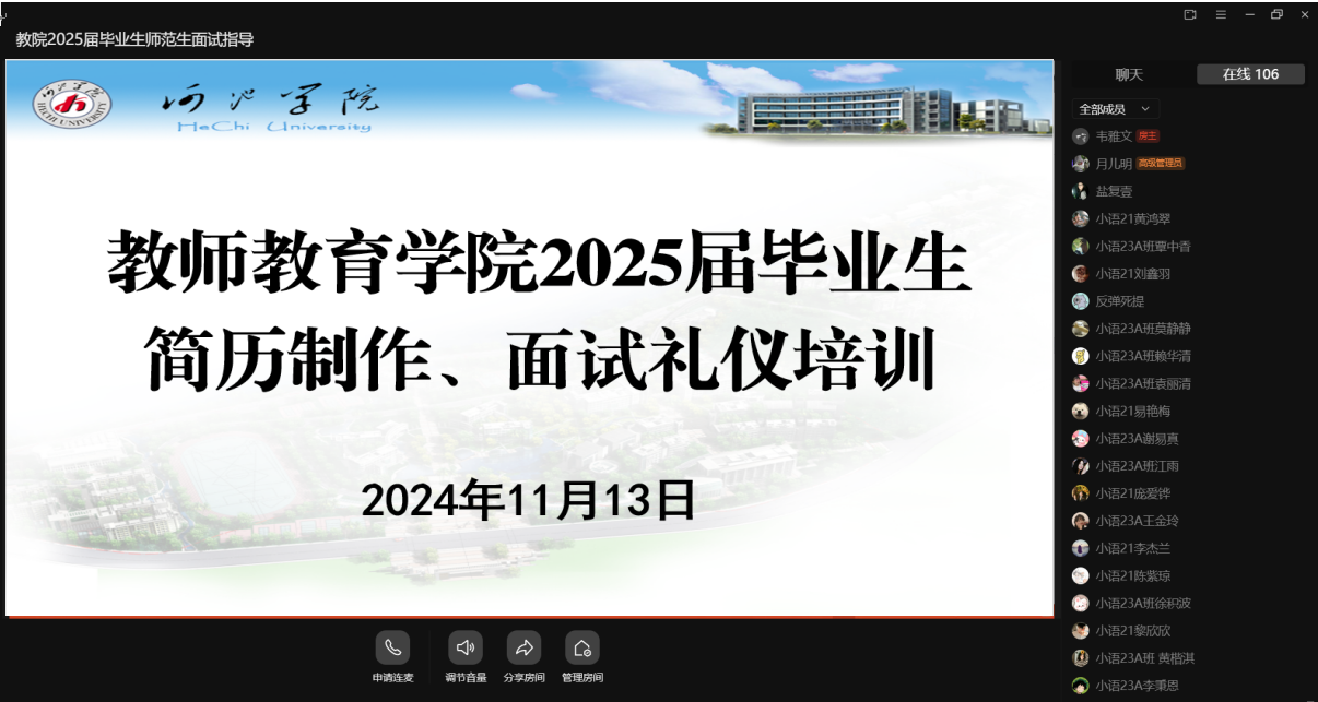 11月13日,为全面提升万象城官网2025届毕业生的专业技能和就业能力,学院谭静副教授、就业辅导员韦雅文为2025届毕业生作师范生面试指导、简历制作和面试礼仪线上培训。下一步,万象城awc官网登录入口将继续把毕业生就业工作作为重中之重,持续关注不同专业的毕业生就业需求,综合施策、精准帮扶,促进2025届重点群体毕业生顺利就业。(作者:韦雅文;摄影:韦雅文;校对:覃良慧;审核:郭英莉)