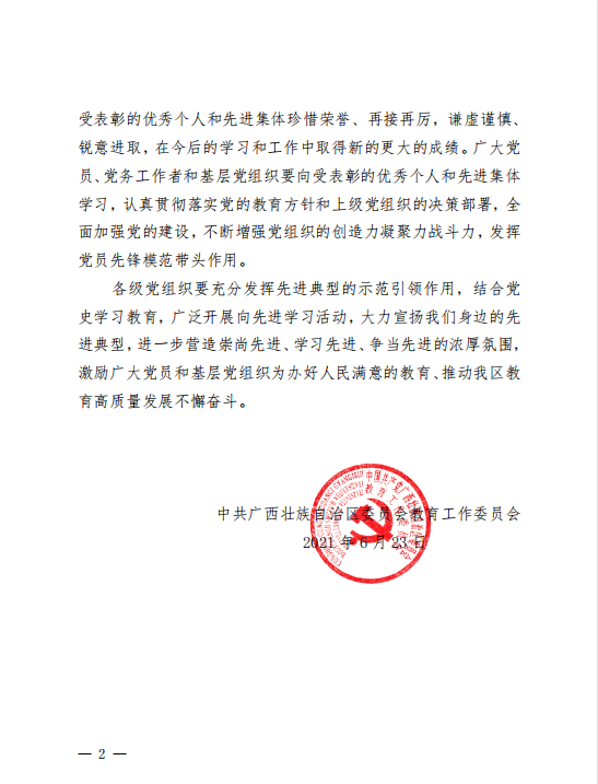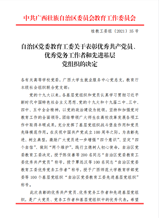 桂教工委组[2021]35号自治区党委教育工委关于表彰优秀共产党员、优秀党务工作者和先进基层党组织的决定