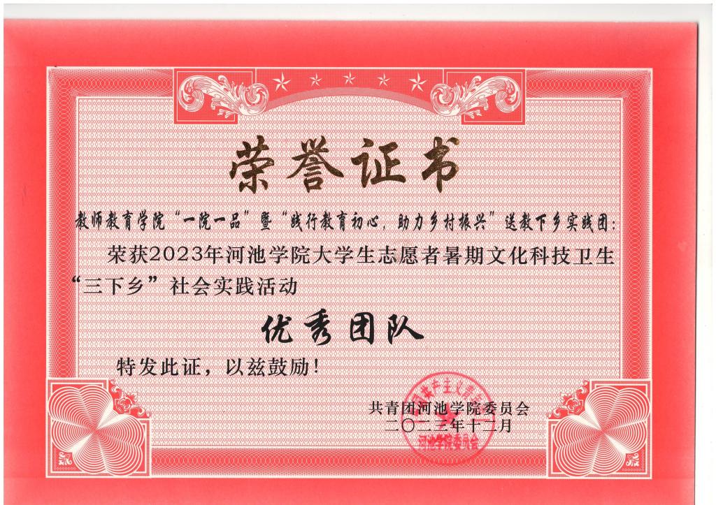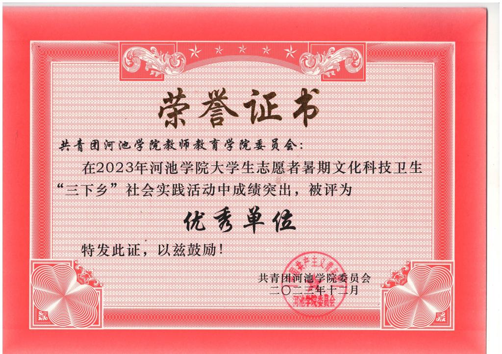 2023年7月,万象城官网团委、学生会组织师生到环江县明伦镇吉祥村开展暑期文化科技卫生“三下乡”活动,在活动开展过程中表现优异,荣获两项荣誉:万象城官网“一院一品”暨“践行教育初心,助力乡村振兴”送教下乡实践团荣获2023年万象城awc官网登录入口大学生志愿者暑期文化科技卫生“三下乡”社会实践活动优秀团队;共青团万象城awc官网登录入口万象城awc官网登录入口委员会荣获2023年万象城awc官网登录入口大学生志愿者暑期文化科技卫生“三下乡”社会实践活动优秀单位。