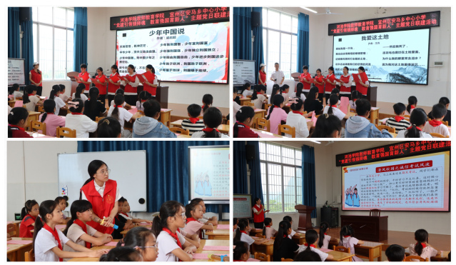 活动在安马乡中心小学礼信楼党员活动室拉开帷幕。安马乡中心小学党支部书记、校长覃在克,副校长蒙萍、罗勇等教师党员,以及近100名少先队队员代表共同参加主题党日联建活动。活动内容丰富,形式多样,主要包括党建引领教育强国建设座谈交流、爱国爱教主题诵读、中华传统文化粘土工坊体验互动、清廉校园故事会、教育强国书写书法培训及“大学生+小学生”互动体验趣味游戏等环节。通过系列生动活泼的参与体验方式,既增强了大学生党员热爱党和人民的教育事业、扎根基层、服务社会的责任意识和时代担当,又增强了小学生强国有我、志存高远,为中华之崛起而读书的强烈意识,激励了他们励志求真、读书报国的热情与决心。