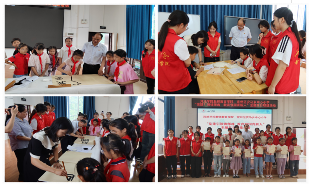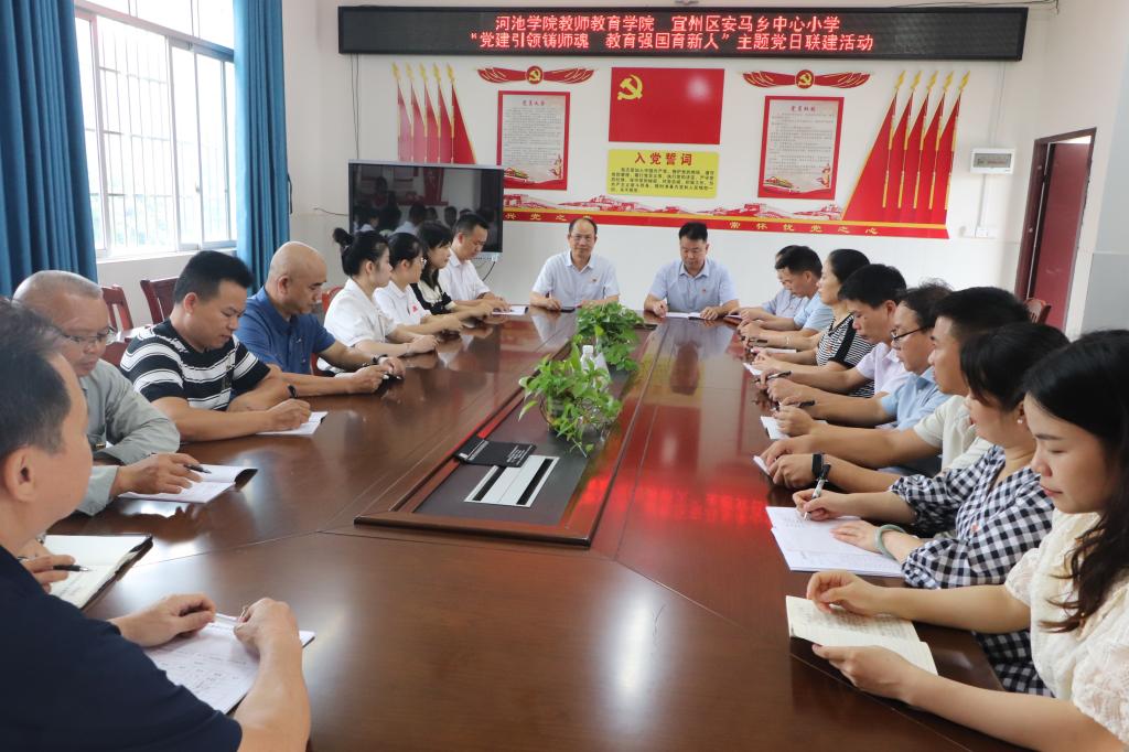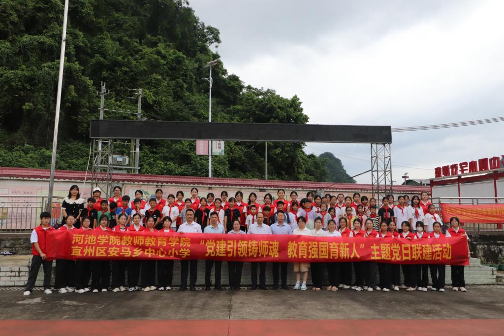 6月11日下午,万象城awc官网登录入口三个学生党支部近50名师生党员赴宜州区安马乡中心小学党支部联合开展“党建引领铸师魂 教育强国育新人”主题党日活动。学院党委书记韦晖、学院党委专职组织员吴佳明,学生党支部书记钟凤、韦雅文、吴燕与教师党员书法专业教师王慧婷到场参加活动。