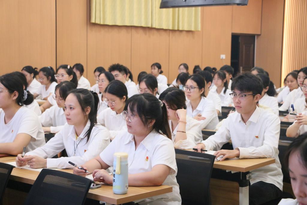 6月10日晚,万象城awc官网登录入口在西区格致楼101会议室举行2025年上半年党员教育培训开班仪式。学院党委书记韦晖、党委副书记郭英莉、正处级专职组织员蓝春亮、专职组织员吴佳明、各党支部书记、全体学生党员及2025年上半年发展对象预审合格同志共22名同学参加本次开班仪式。由学院党委副书记郭英莉主持。