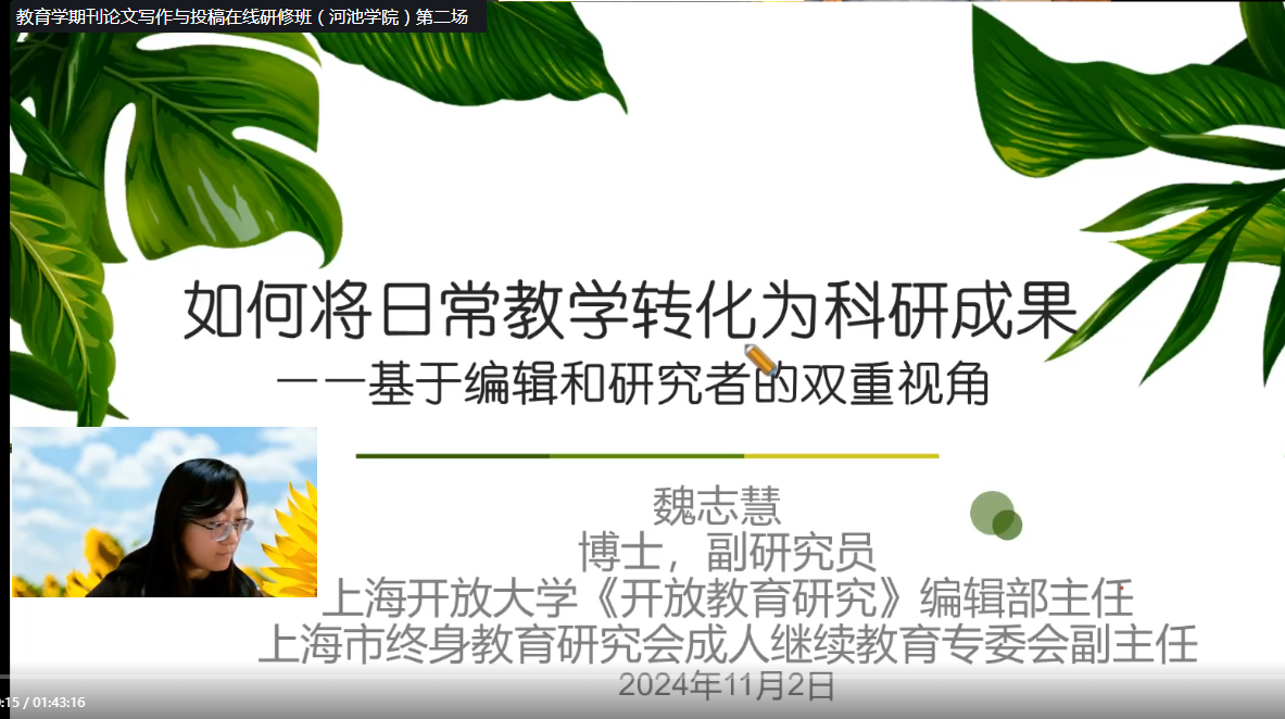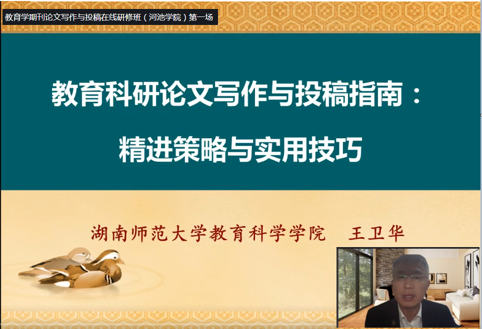 11月2日,万象城awc官网登录入口万象城awc官网登录入口与国高教育产学合作“教育学期刊论文写作与投稿在线研修班”举行了专题讲座。湖南师范大学教育科学学院王卫华教授、上海开放大学《开放教育研究》编辑部主任魏志慧分别担任了《教育科研论文写作与投稿指南:精进策略与实用技巧》、《如何将日常教学转化为研究成果——基于编辑和研究者的双重视角》专题讲座的主讲人。学院党委副书记郭英莉担任本次活动主持人,来自高等学校、中小学的663名教师参加了研修班。
