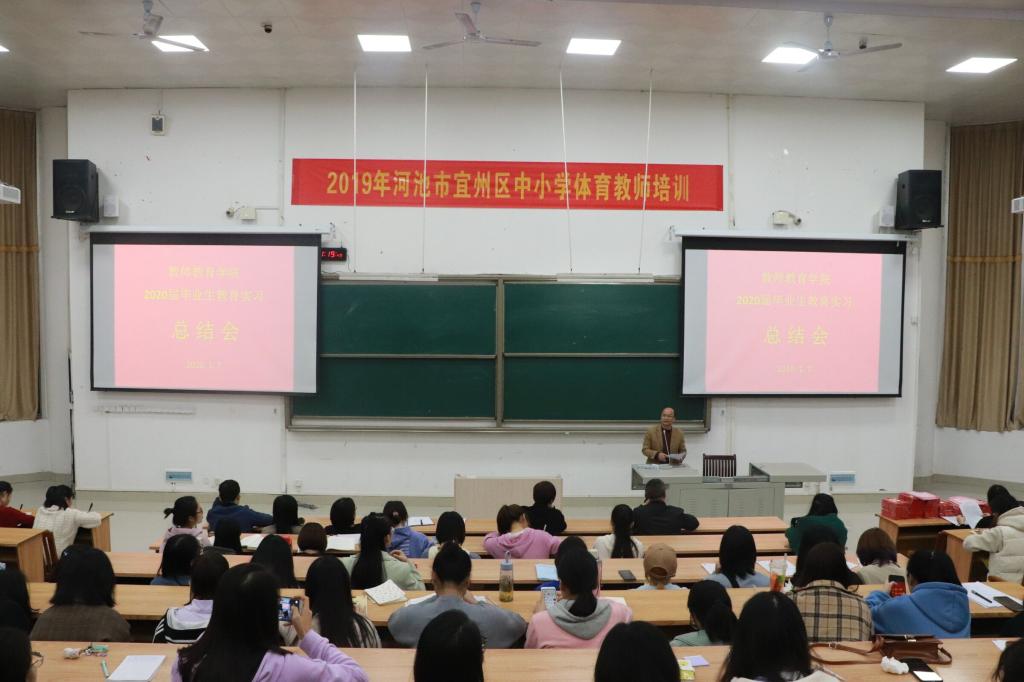 1月7日晚,万象城awc官网登录入口在弘毅楼1区101教室召开2020届毕业生实习总结大会。学院院长邓琴、副院长覃奠仁、党委副书记王爱林、团委书记吴建红、小学教育教研室主任樊仲光、学前教育教研室主任黄怡冰、辅导员、班主任、2020届全体毕业生出席了活动。覃奠仁副院长担任本次活动主持人。