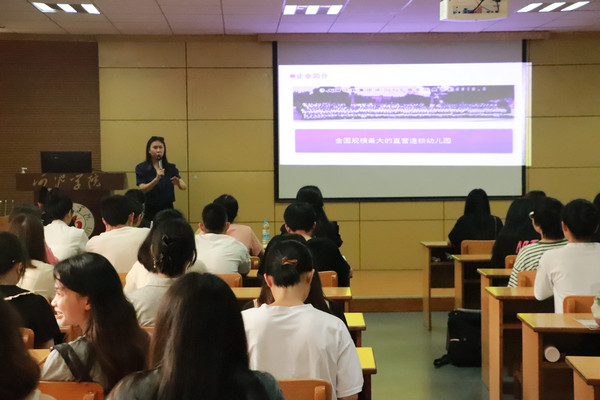在宣讲会上,小红帽幼教集团工会主席覃金在从企业情况、岗位需求、福利待遇等方面向同学们进行多方位介绍。学前教育专业2011届毕业生、现任小红帽幼教集团外省片区区域长、高新幼儿园园长刘京京向同学们分享自己在小红帽幼教集团的工作收获,并鼓励树立正确的就业观念和就业理想。小红帽幼教集团柳州片区区域长、柳江区第三幼儿园园长兰燕向同学们展示部分幼儿园基本情况、为同学们答疑解惑。