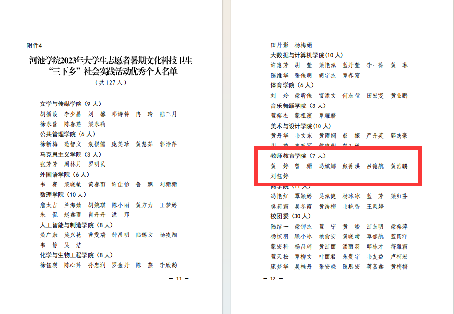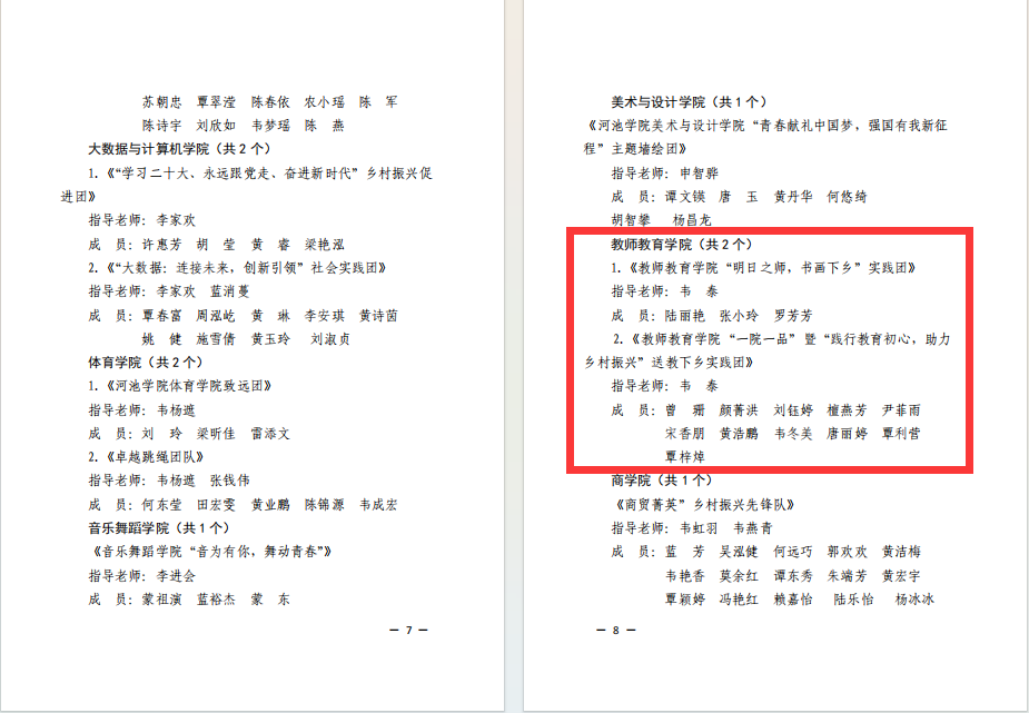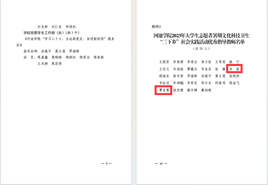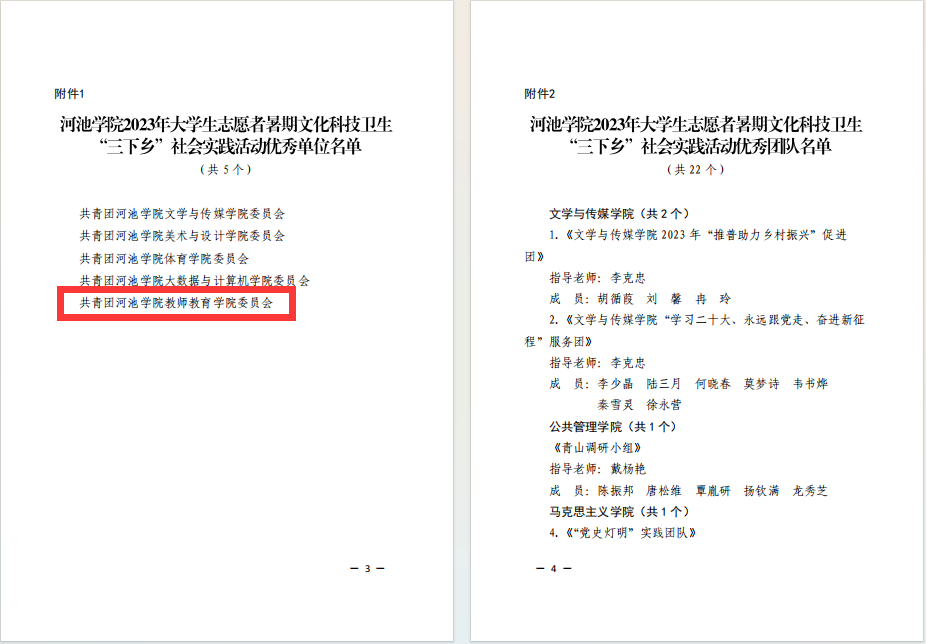根据《关于表彰万象城awc官网登录入口2023年大学生志愿者暑期文化科技卫生“三下乡”社会实践活动优秀单位、优秀团队、优秀指导教师、优秀个人和优秀调研报告的决定》(校党发[2023]76号)文件精神,共青团万象城awc官网登录入口万象城awc官网登录入口委员会荣获“万象城awc官网登录入口2023年大学生志愿者暑期文化科技卫生‘三下乡’社会实践活动优秀单位”荣誉称号,万象城awc官网登录入口“明日之师,书画下乡”实践团和万象城awc官网登录入口“一院一品”暨“践行教育初心,助力乡村振兴”送教下乡实践团荣获“万象城awc官网登录入口2023年大学生志愿者暑期文化科技卫生‘三下乡’社会实践活动优秀团队”荣誉称号,韦泰、覃良慧两名老师荣获“万象城awc官网登录入口2023年大学生志愿者暑期文化科技卫生‘三下乡’社会实践活动优秀指导教师”荣誉称号;黄婷等7名学生荣获“万象城awc官网登录入口2023年大学生志愿者暑期文化科技卫生‘三下乡’社会实践活动优秀个人”荣誉称号,《关于广西偏远民族乡镇小学学生受教育情况的调查研究——立足于全州东山瑶族乡清水中心小学》和《关于乡村小学教育情况的调查研究》荣获“万象城awc官网登录入口2023年大学生志愿者暑期文化科技卫生‘三下乡’社会实践活动优秀调研报告”。