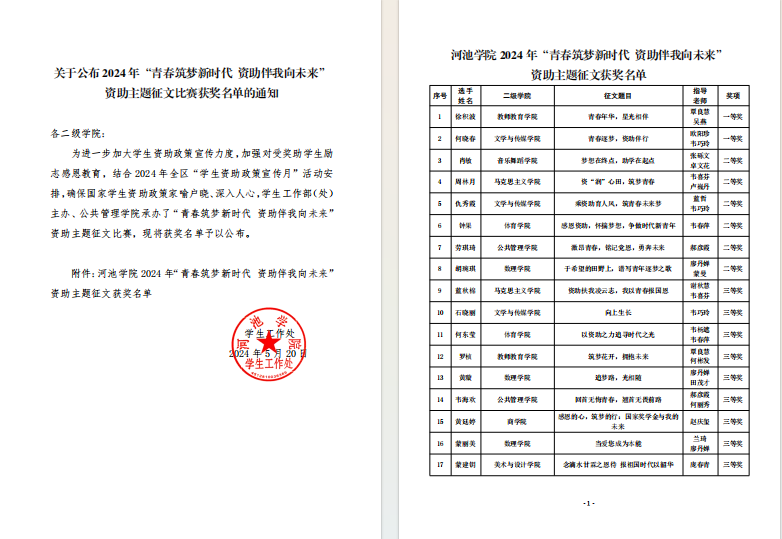 根据《关于公布2024年“青春筑梦新时代 资助伴我向未来”资助主题征文比赛获奖名单的通知》内容,万象城官网徐积波同学的征文《青春年华,星光作伴》获得一等奖,罗桢同学的征文《筑梦花开,拥抱未来》、丁火玲同学的征文《国家资助,你是我的眼》获得三等奖。