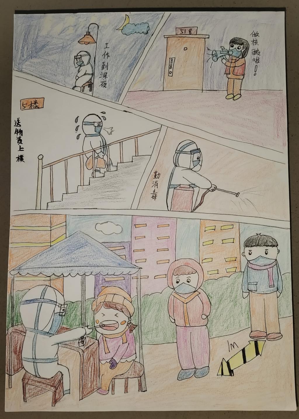 在第二期“白衣天使忙碌的一天”主题绘画作品中,广大医务工作者白衣执甲、逆行出征,舍小家为大家,始终坚守在核酸检测、消毒消杀、隔离观察、医疗救治、应急外援等疫情防控第一线,牢牢守住了全校师生健康的生命防线。同学们通过对这些可歌可敬的白衣天使刻画,充分展示了白衣天使友爱、团结、互助、奉献、牺牲的精神,赞颂了医护人员不畏生死、无私奉献地守护人间大爱的精神,表达了同学们对奋战在抗击疫情一线的工作人员的崇高敬意。