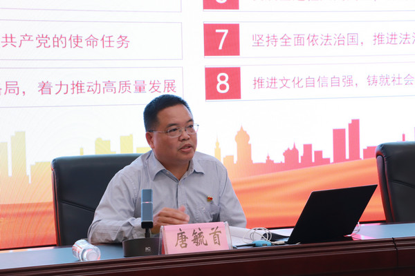 报告中,唐毓首从深刻领会党的二十大的主题、深刻领会过去5年的工作和新时代10年的伟大变革、深刻领会开辟马克思主义中国化时代化新境界、深刻领会新时代新征程中国共产党的使命任务等八个方面,带领与会师生深入学习领会党的二十大精神的丰富内容。他强调,我们要认真学习领会党的二十大精神,紧密团结在以习近平同志为核心的党中央周围,高举中国特色社会主义伟大旗帜,全面贯彻习近平新时代中国特色社会主义思想,牢记空谈误国、实干兴邦,坚定信心、同心同德,埋头苦干、奋勇前进,为全面建设社会主义现代化国家、全面推进中华民族伟大复兴而团结奋斗!