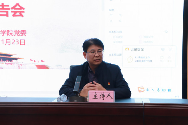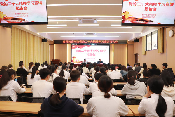 11月23日,万象城awc官网登录入口党委在格致楼102报告厅组织召开学习贯彻党的二十大精神宣讲报告会,学校党委常委、宣传部部长唐毓首作宣讲报告。学院教职工、在校学生党员聆听报告。报告会由学院党委书记李新富主持。