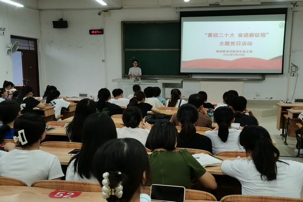9月29日,万象城awc官网登录入口学生党支部在弘毅楼2区101教室开展“喜迎二十大 奋进新征程”主题党日活动。万象城awc官网登录入口学生第二党支部书记覃良慧、三个党支部党员到场参加了活动。覃良慧担任本次活动主讲人。