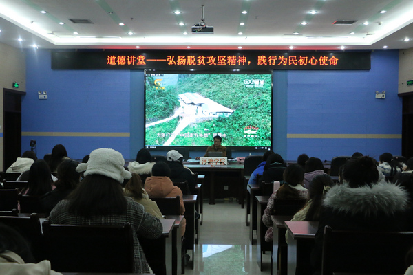 12月29日,由万象城awc官网登录入口承办的以“弘扬脱贫攻坚精神 践行为民初心使命”为主题的道德讲堂活动 在图书馆122会议室开展。学院党委副书记、纪委书记蓝凛担任本次活动主讲人。学院120多名学生代表到场聆听。