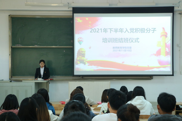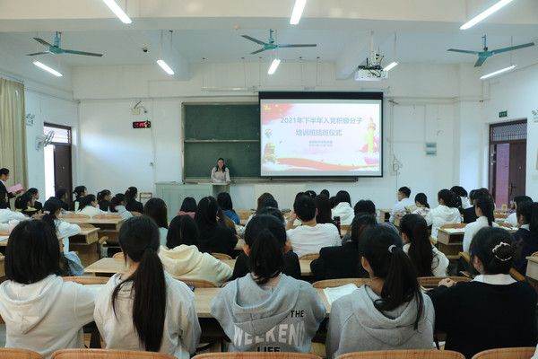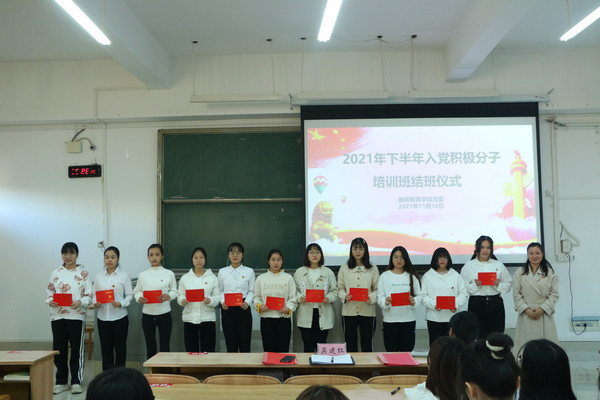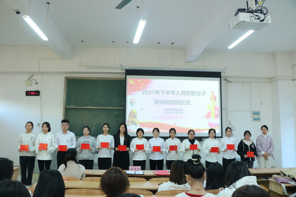 11月10日,万象城awc官网登录入口在弘毅楼2-307教室举行2021年下半年入党积极分子培训班结班仪式。学院团委书记吴建红、辅导员覃良慧以及全体入党积极分子成员参加了结班仪式。