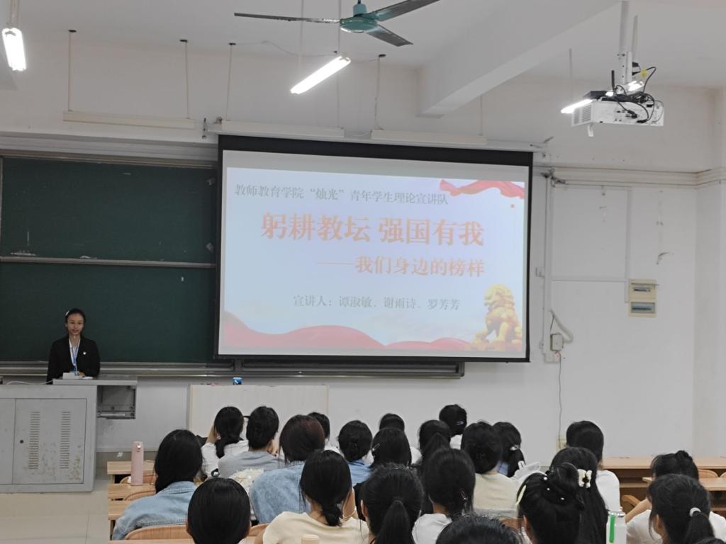 在宣讲活动中,“烛光”青年学生理论宣讲队以“躬耕教坛强国有我”为主题,带领各团支部同学一起学习学习习近平总书记第39个教师节致信全国优秀教师代表座谈会精神,并以"全国优秀共产党员""全国十佳师德标兵""全国教书育人楷模"张桂梅老师为例,勉励同学们要深入学习习近平总书记关于教育家精神的重要指示,以张桂梅老师为榜样,切实增强大力弘扬教育家精神的内在自觉,立志在立德树人、培根铸魂的生动实践中实现自己的人生价值。